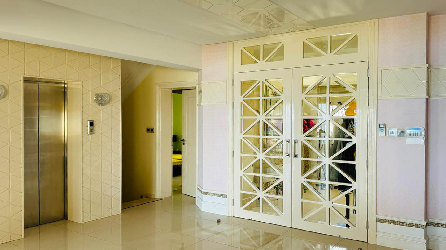 The villa is arranged across three floors and includes five bedrooms in the main house, along with six bathrooms (one of them featuring a storage room). On the ground floor, there is also a guest bedroom with its own en-suite bathroom. An OTIS lift provides easy access to all levels, including the second floor, where three spacious bedrooms are located, each with its own private bathroom.