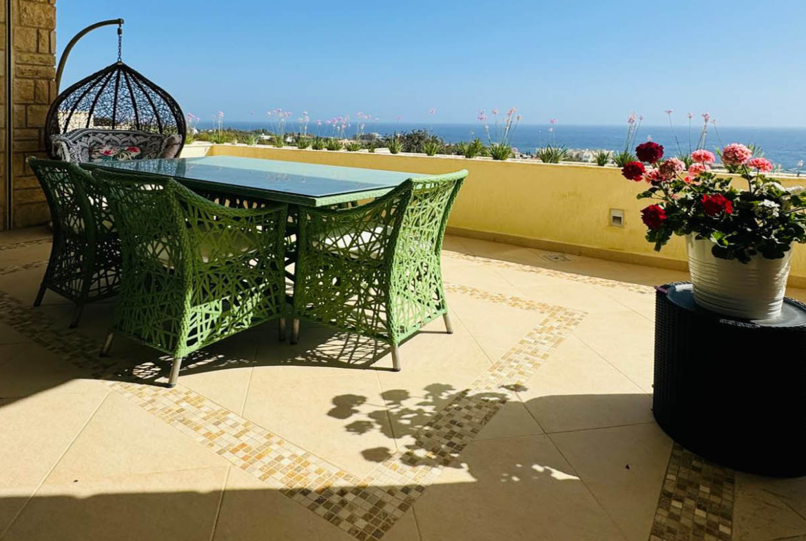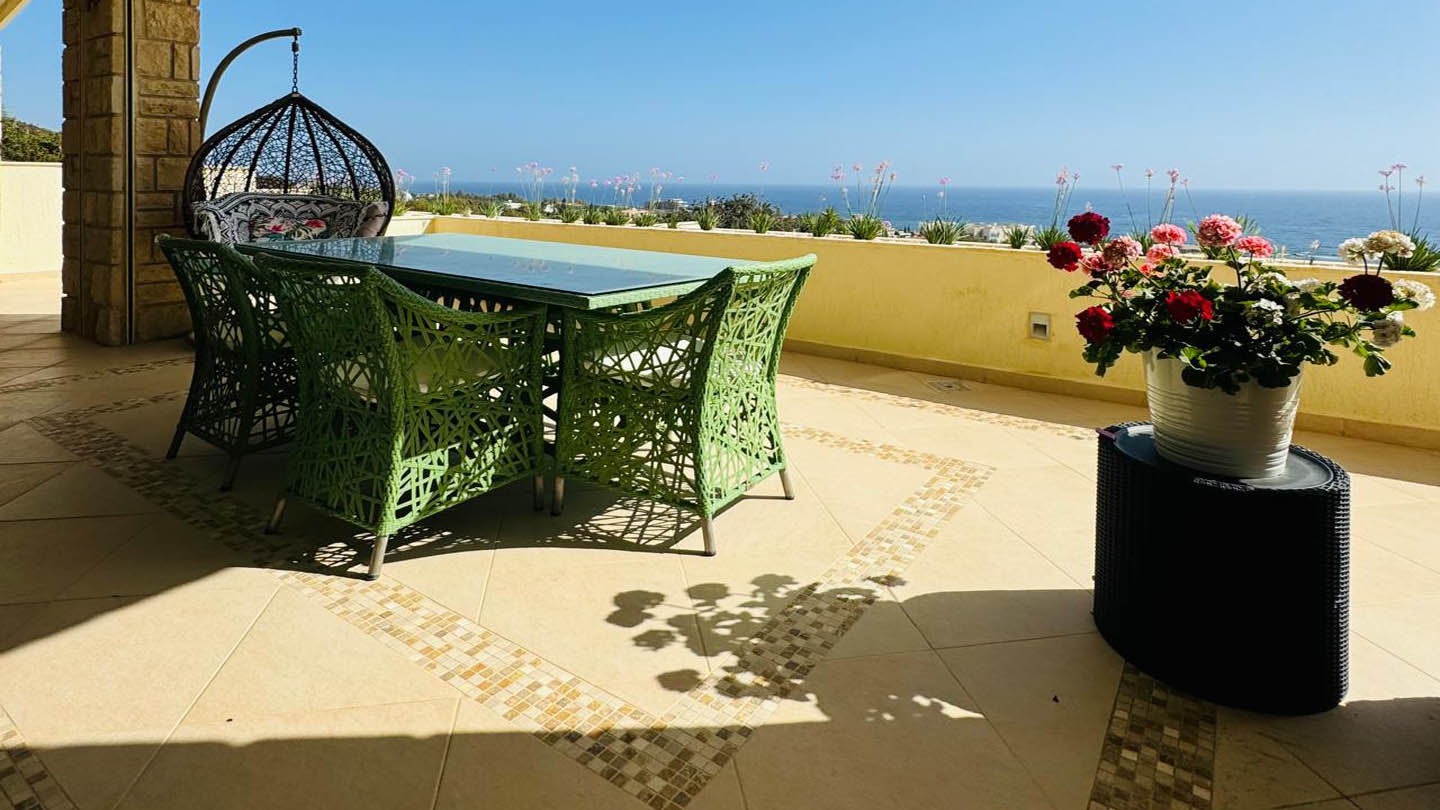 The veranda becomes a true extension of the home in the open air. It offers everything needed for relaxed outdoor living: a dining area with a table and woven chairs, and a suspended cocoon chair perfect for reading or private contemplation of the sea. A built-in barbecue area adds practicality, turning the veranda into an excellent space for family lunches or welcoming guests. From here, the view stretches to the Mediterranean horizon, where sky and waves merge into a peaceful, painterly panorama.