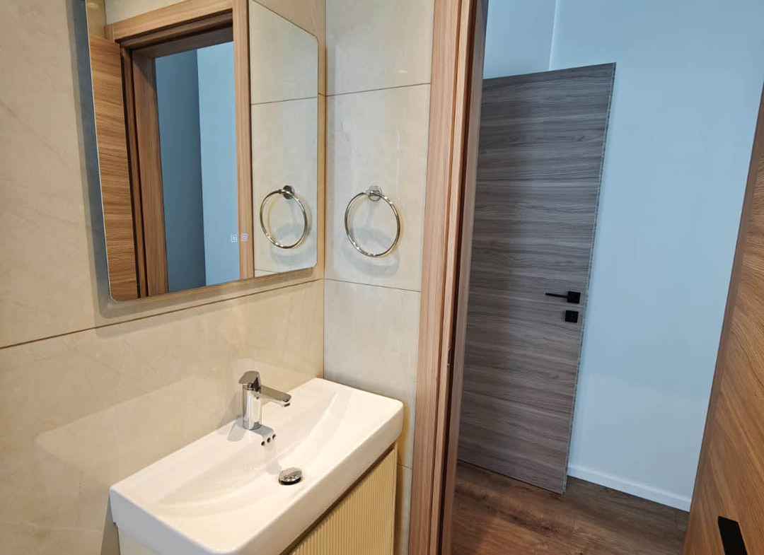 Light furniture and wall finishing, including a white ceiling, which reflects a lot of light on wooden decor and modern style elements. Calm bright shades of walls, against such a background any dark or bright decor details will look perfect. A bathroom tiles with a soft pattern speak for themselves. 2-bedroom apartment turned out very cute. I would say, this is the best option for newlyweds, ore small family.