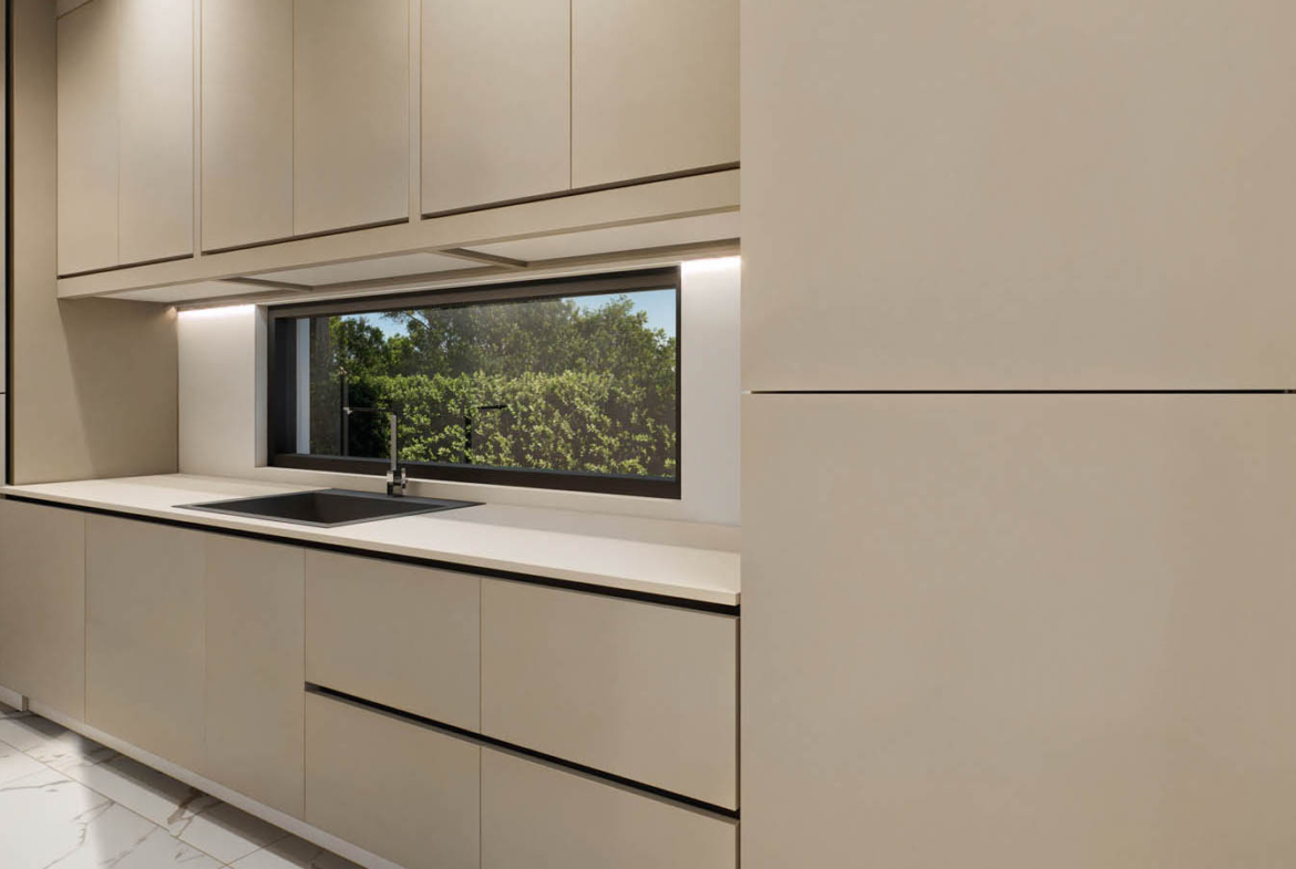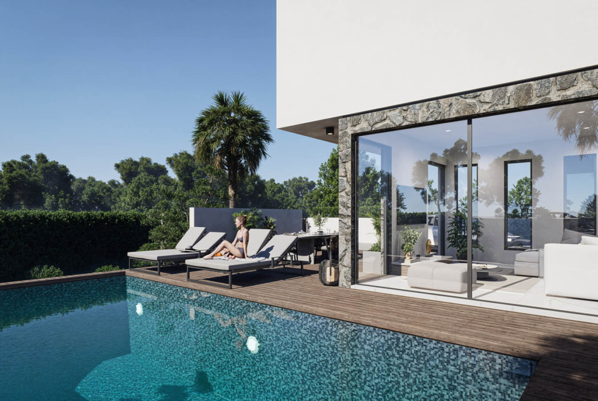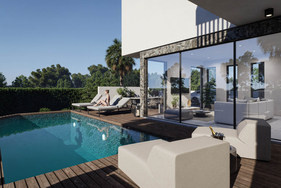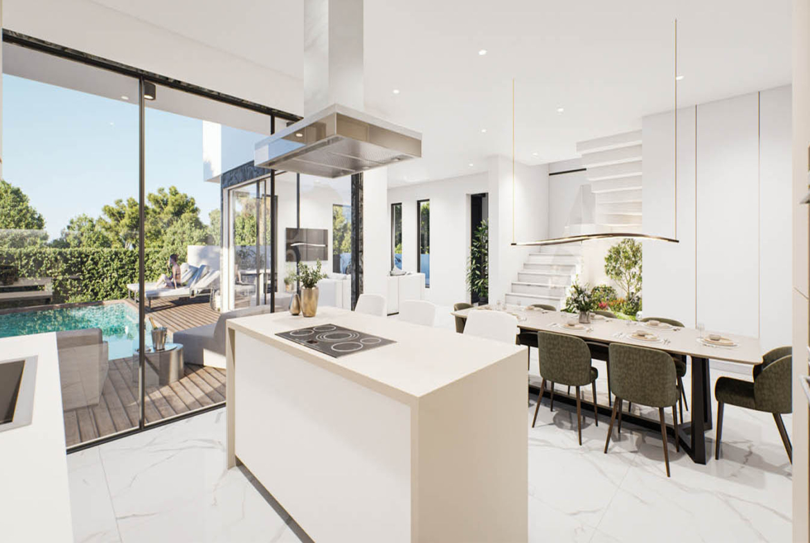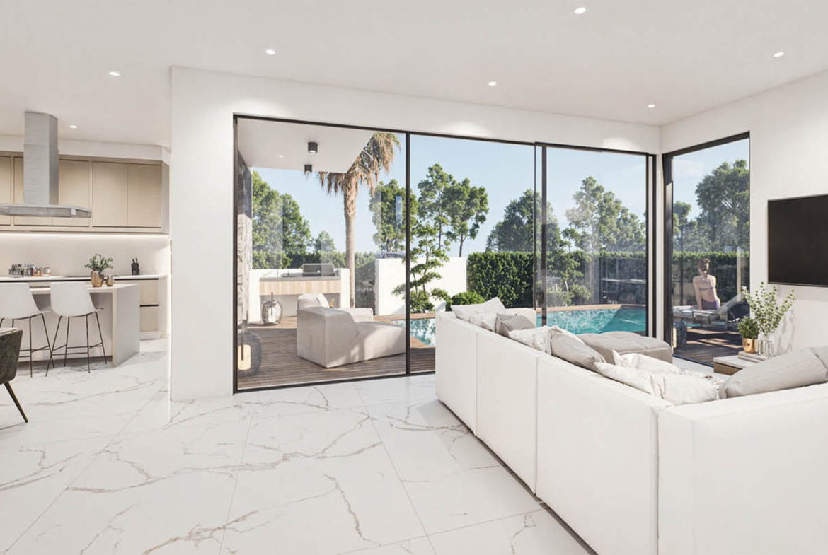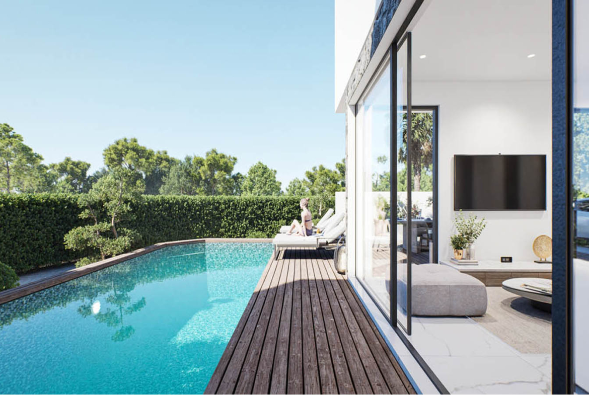 The villa spans over 237 square meters on a 582 square meter plot, thoughtfully designed to maximize space and light. The open-concept layout fluidly combines the kitchen, dining, and living areas, creating a flexible space ideal for both relaxation and entertaining. High ceilings and expansive sliding glass doors open up to a spacious patio and private pool area, offering magnificent views of the Mediterranean Sea.