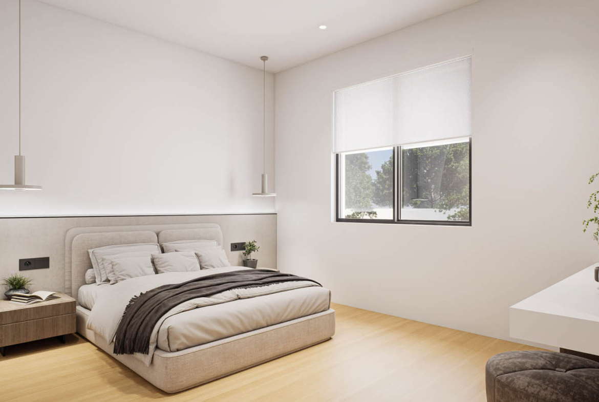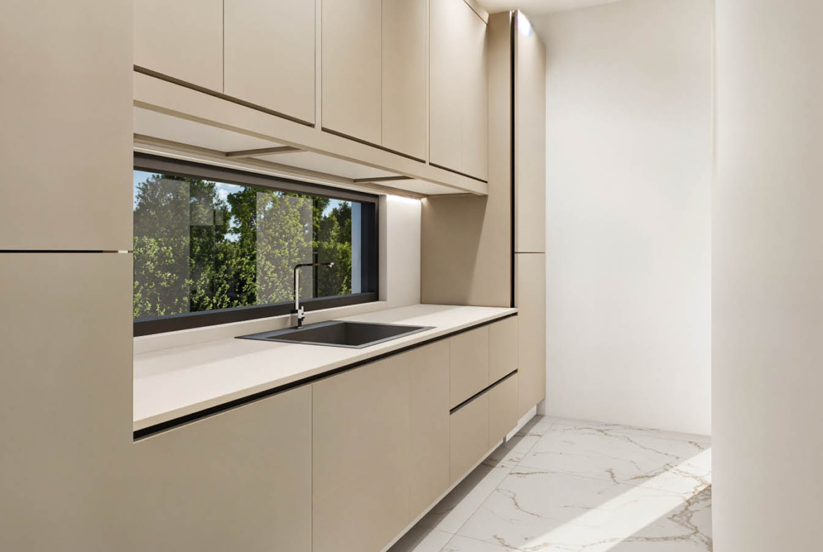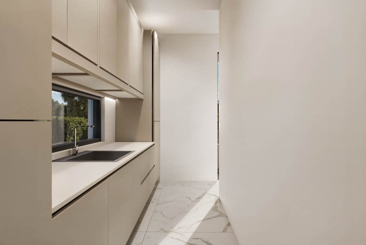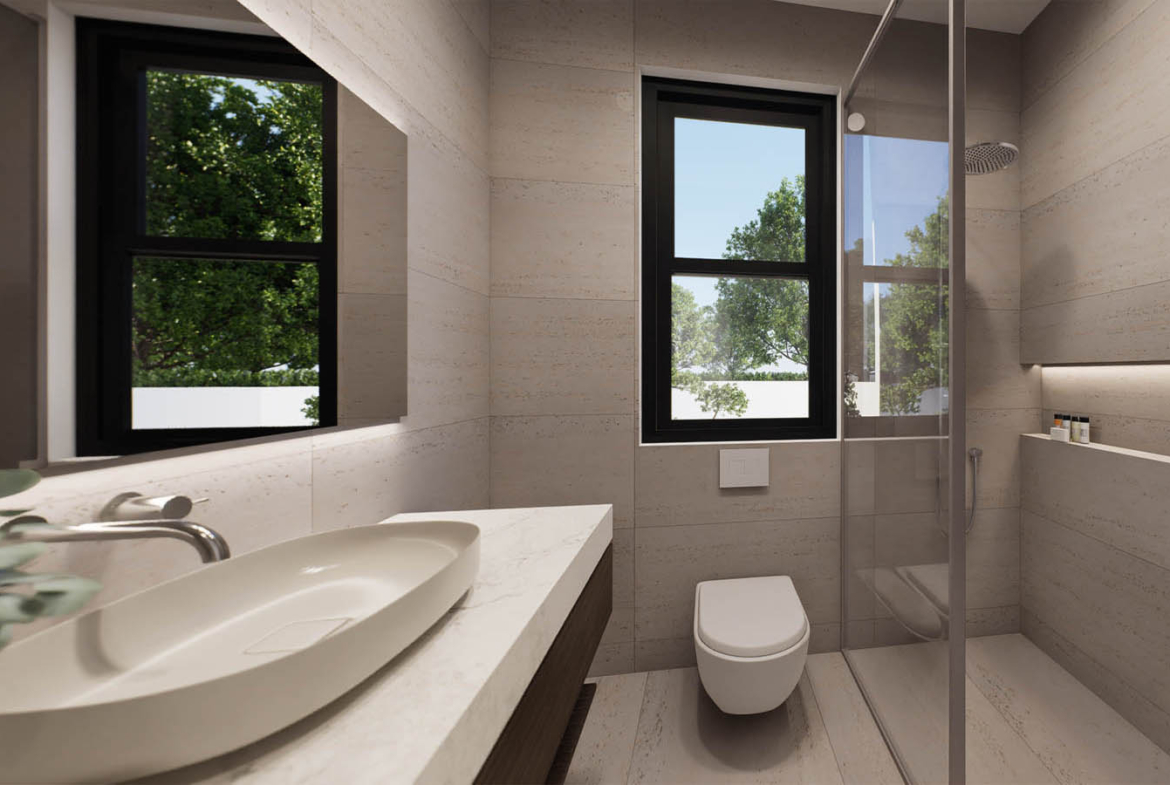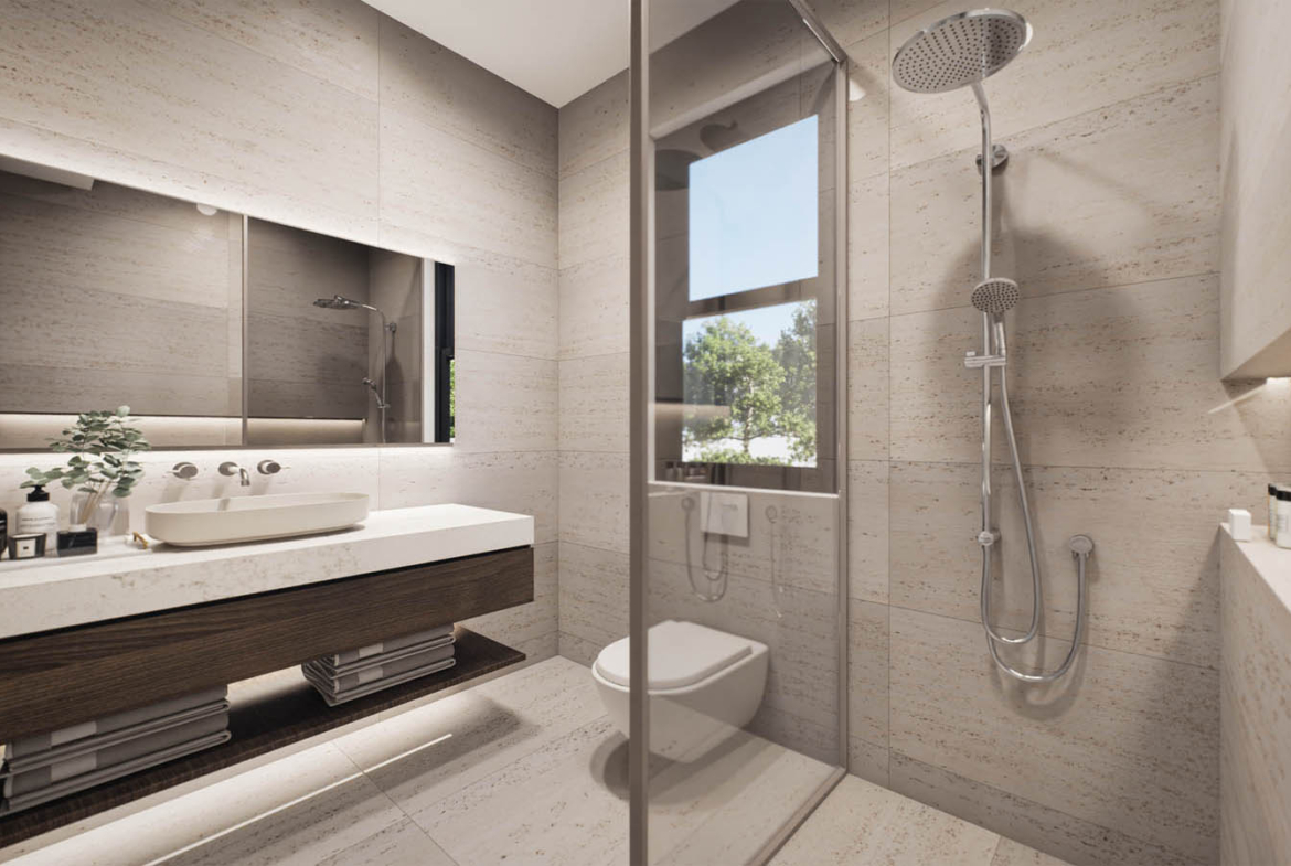 Each of the four spacious bedrooms features an en-suite bathrooms and a private balcony, ensuring comfort and privacy. There is one guest WC. The modern design is complemented by high-end finishes and designer touches, creating an atmosphere of understated elegance.