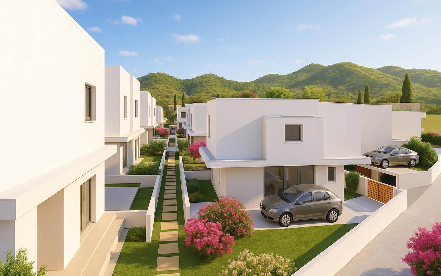 Twenty-six detached and semi-detached villas will rise on the green hills of Pegeia, where pine trees meet the blue of the Mediterranean. The architecture is a modern take on the Mediterranean ethos: crisp white volumes, expansive light-washed planes, glass and natural stone.