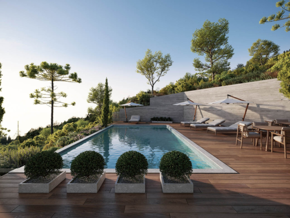 • A large communal swimming pool set at the heart of a beautifully designed wooden deck terrace
