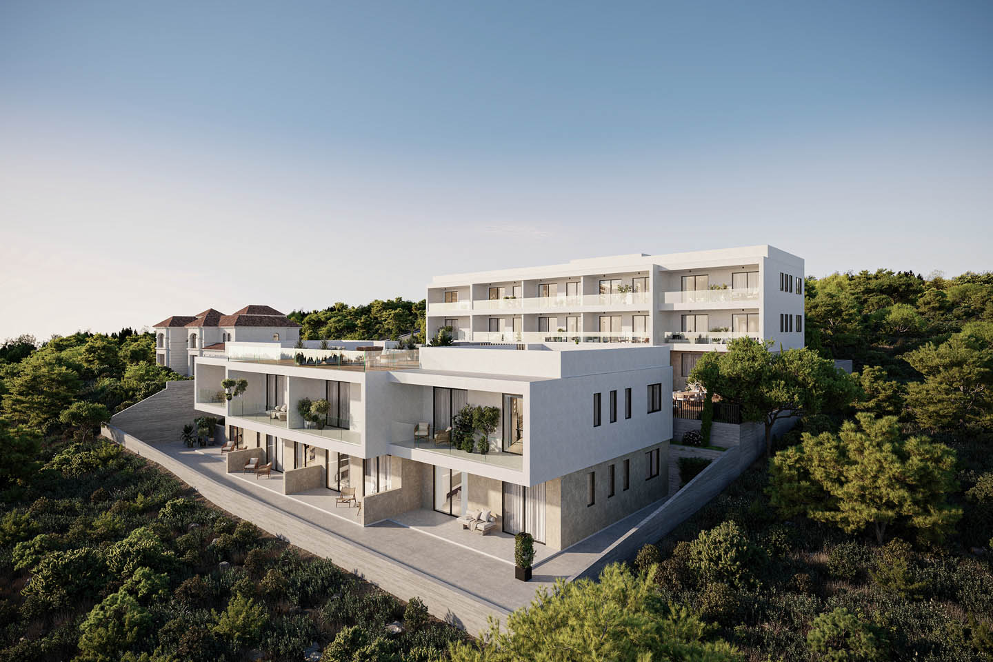 The minimalist architecture of the complex is expressed in a contemporary Mediterranean style: clean geometric façade lines, frameless glass balustrades, expansive panoramic windows, soft sandy-white tones, and generous terraces create a sense of openness and complete harmony with nature. The façades have been carefully designed with optimal sun orientation in mind, ensuring that every apartment is bathed in natural light throughout the day.