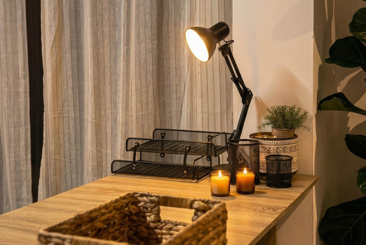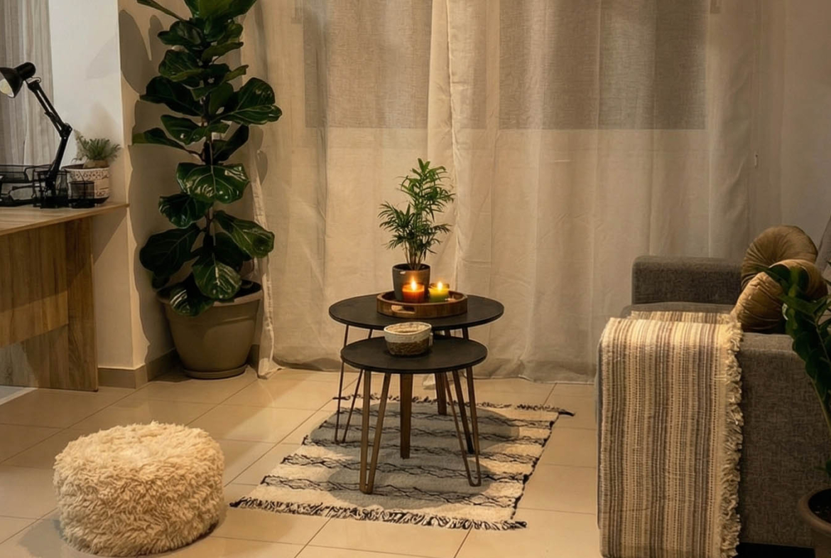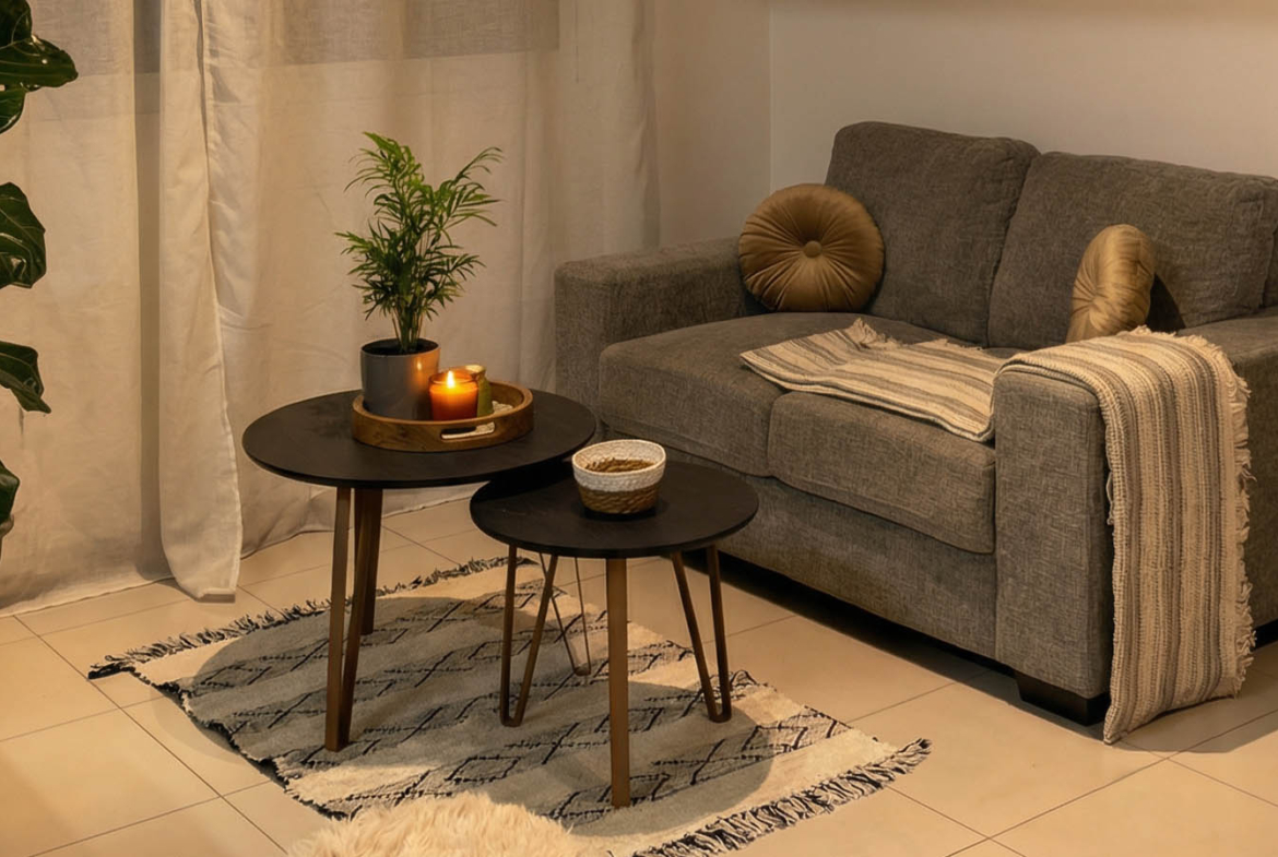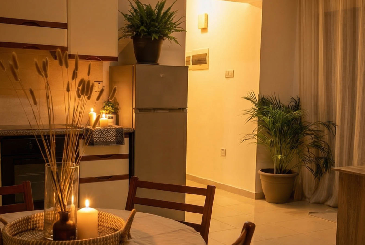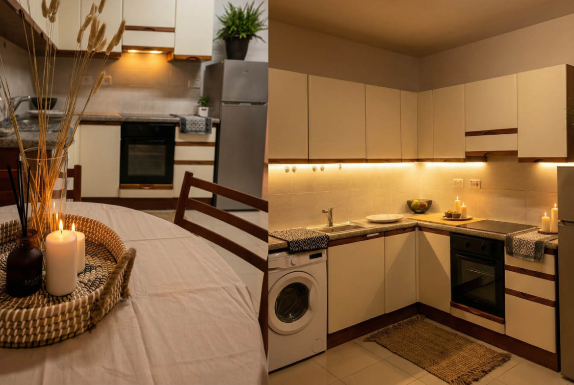 The kitchen carries this aesthetic forward — an L-shaped layout with sleek cabinetry and quality appliances. Under-cabinet lighting creates a soft, inviting glow, while black accents and potted plants bring the space to life. There’s a washing machine, stovetop, oven, and a full-sized refrigerator — all ready for everyday use. Even the dining area feels cinematic — a round wooden table, candles, decorative pieces — just take a seat and dinner already feels like a special occasion.