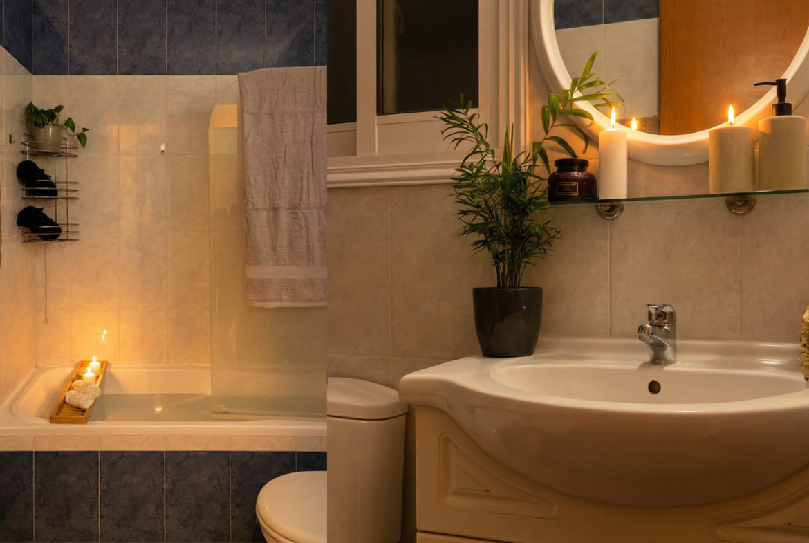 The bathroom is clean and inviting, with spa-like touches and built-in shelving. White and blue tiles, a softly lit mirror, a spot for candles — it’s a peaceful space, made for unwinding at the end of the day.