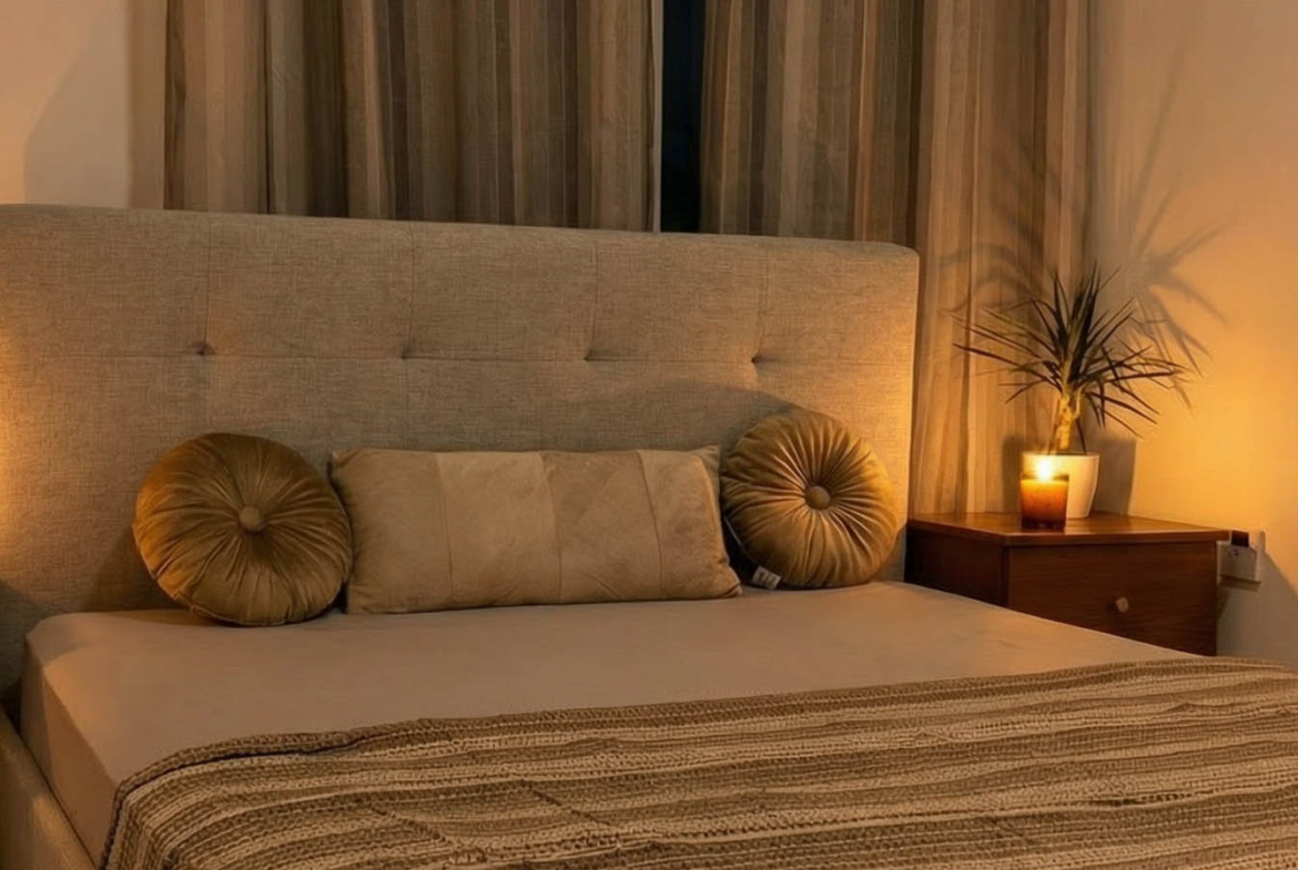 The bedroom brings a quiet kind of peace. A large bed with a soft, padded headboard, decorative cushions, and minimal but thoughtful decor. The warm glow of bedside lamps adds to the coziness, especially in the evenings. It’s the kind of place where you want to sleep with the windows open, breathing in the coastal air of Paphos drifting through the quiet Universal streets.