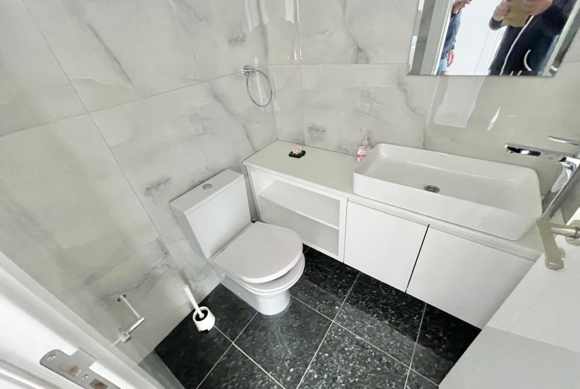 Step inside, and the first thing that catches your breath is the light. This home is full of it. The living room feels even more spacious thanks to the white walls and the deep sheen of the dark, glossy floor tiles. The flooring reflects the daylight pouring in from the balcony, casting patterns across the furniture. The interior is calm and functional: muted-tone sofas, a sleek TV console, a round glass dining table with soft, modern chairs. Every element is in harmony. It’s easy to imagine relaxed family evenings, an early-morning Zoom call, or a sunset shared with friends and a glass of wine.