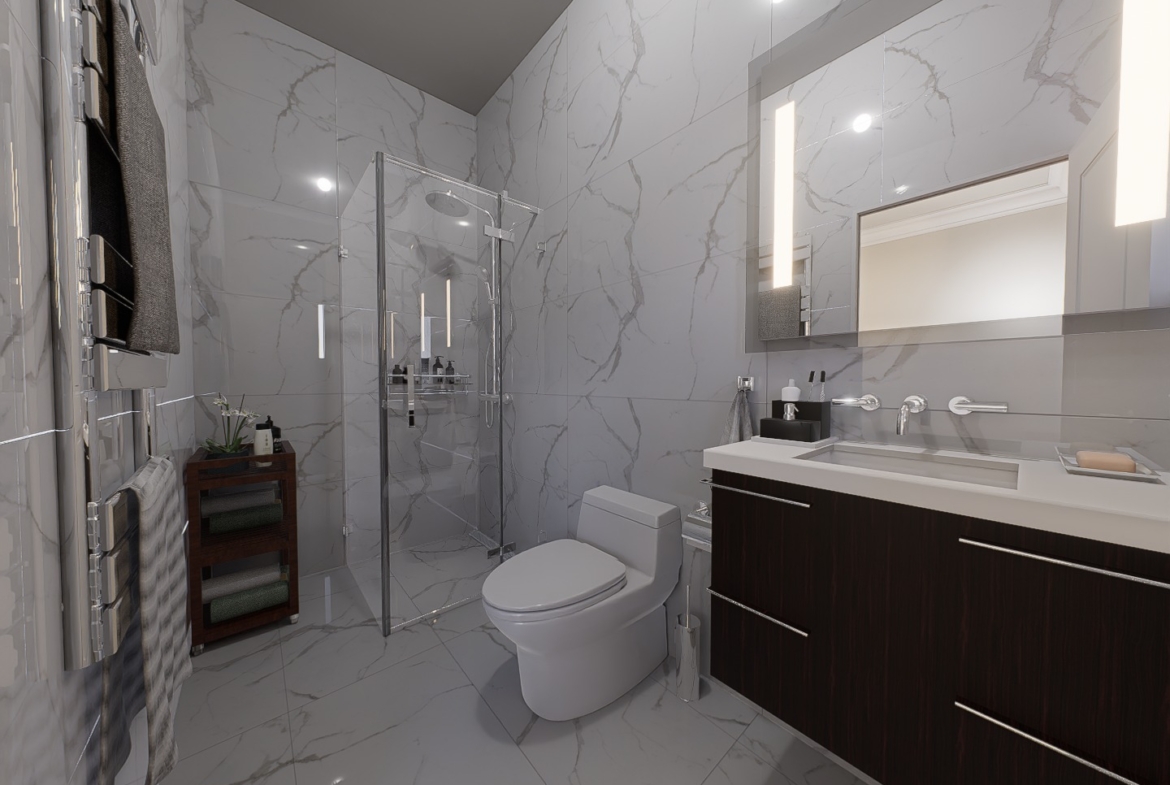 The bedroom is a separate territory of silence. There is nothing excessive here, yet everything is in place to create the feeling of a high-end hotel where you are the only guest: a restrained palette, tactile textures, gentle lighting, and a large feature wall behind the headboard. The window brings depth and air, while the right ceiling height strengthens the sense of space. The bathroom continues the theme of “modern purity”: marble-effect large-format tiles, a glass shower, and minimalist fixtures—exactly the kind of finish where functionality looks like design, not compromise.
