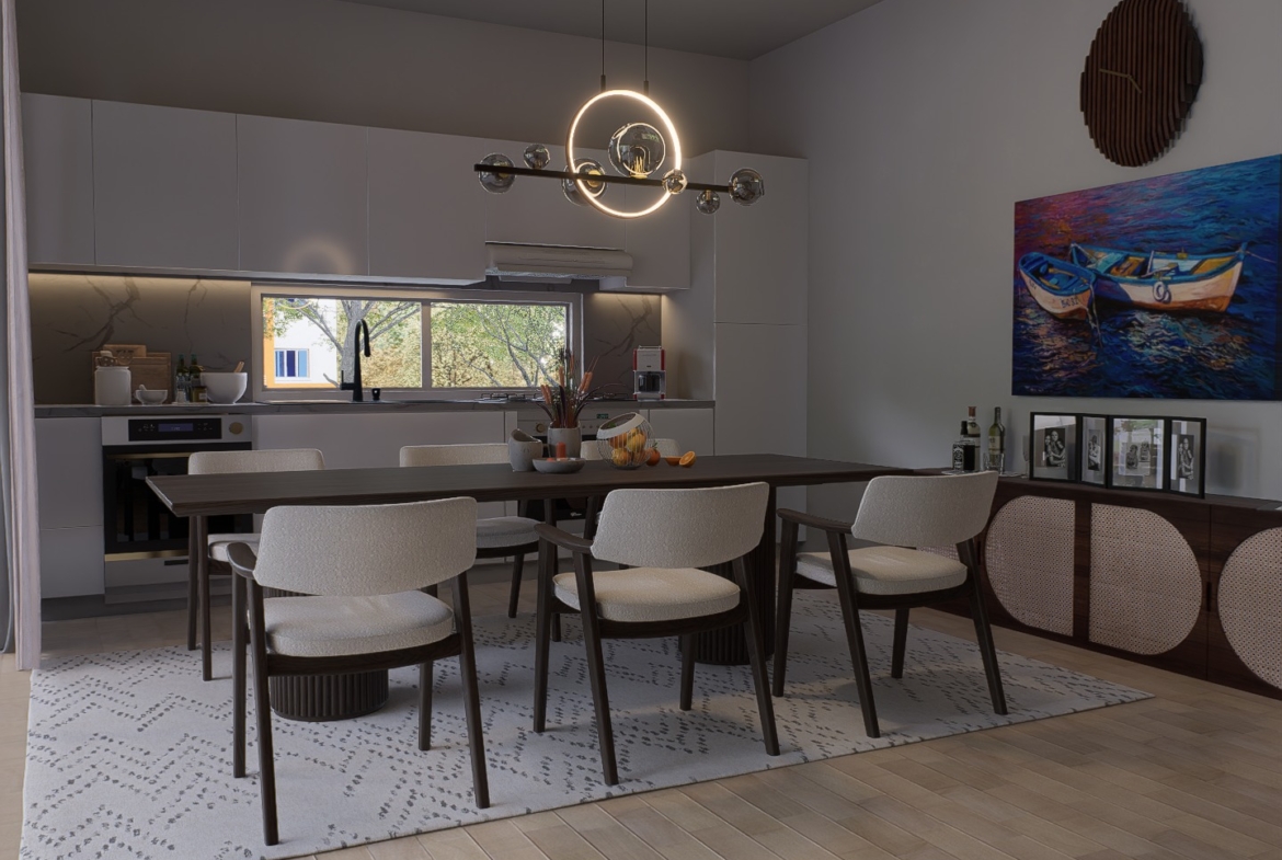 Inside, you are welcomed by a contemporary open-plan layout: kitchen, dining and lounge come together into one seamless space where it is easy to “live beautifully,” not merely exist. The visuals suggest that calm, effortless luxury that does not need to prove anything: light kitchen fronts, clean lines, balanced proportions, and accent lighting that, in the evening, turns the home into a soft, intimate scene. Large sliding doors open onto a covered terrace—an extension of the living area—where morning coffee becomes a ritual rather than a pause between tasks. It is just as easy to imagine a late lunch in the shade, a book on a sun lounger, and conversations you don’t want to end.