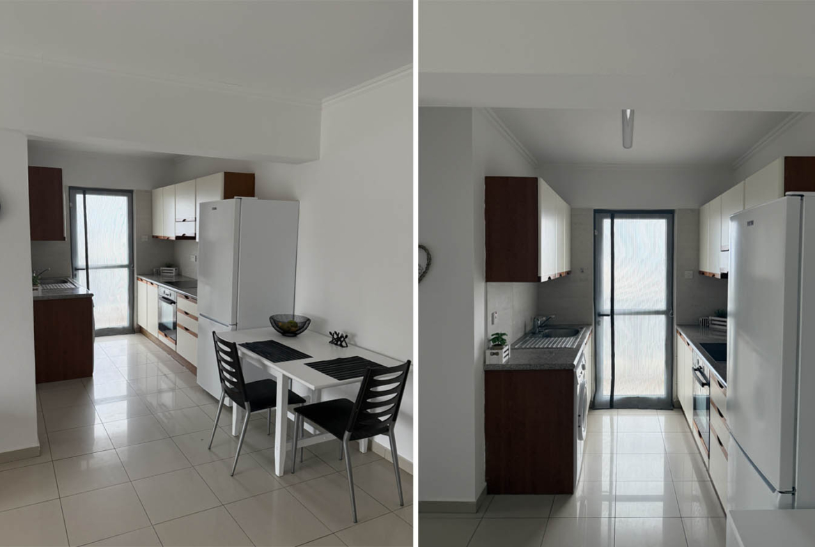The kitchen deserves special attention. It is practical, convenient, and arranged so that everything you need is always close at hand. A linear workspace with a good number of cupboards, fitted appliances, and a dining table makes this area highly functional for everyday life. It is a space where breakfast can be prepared quickly before heading to the sea, or where a calm evening at home can be enjoyed with ease. The kitchen does not compete with the living area but rather continues its style — restrained, clean, and modern.