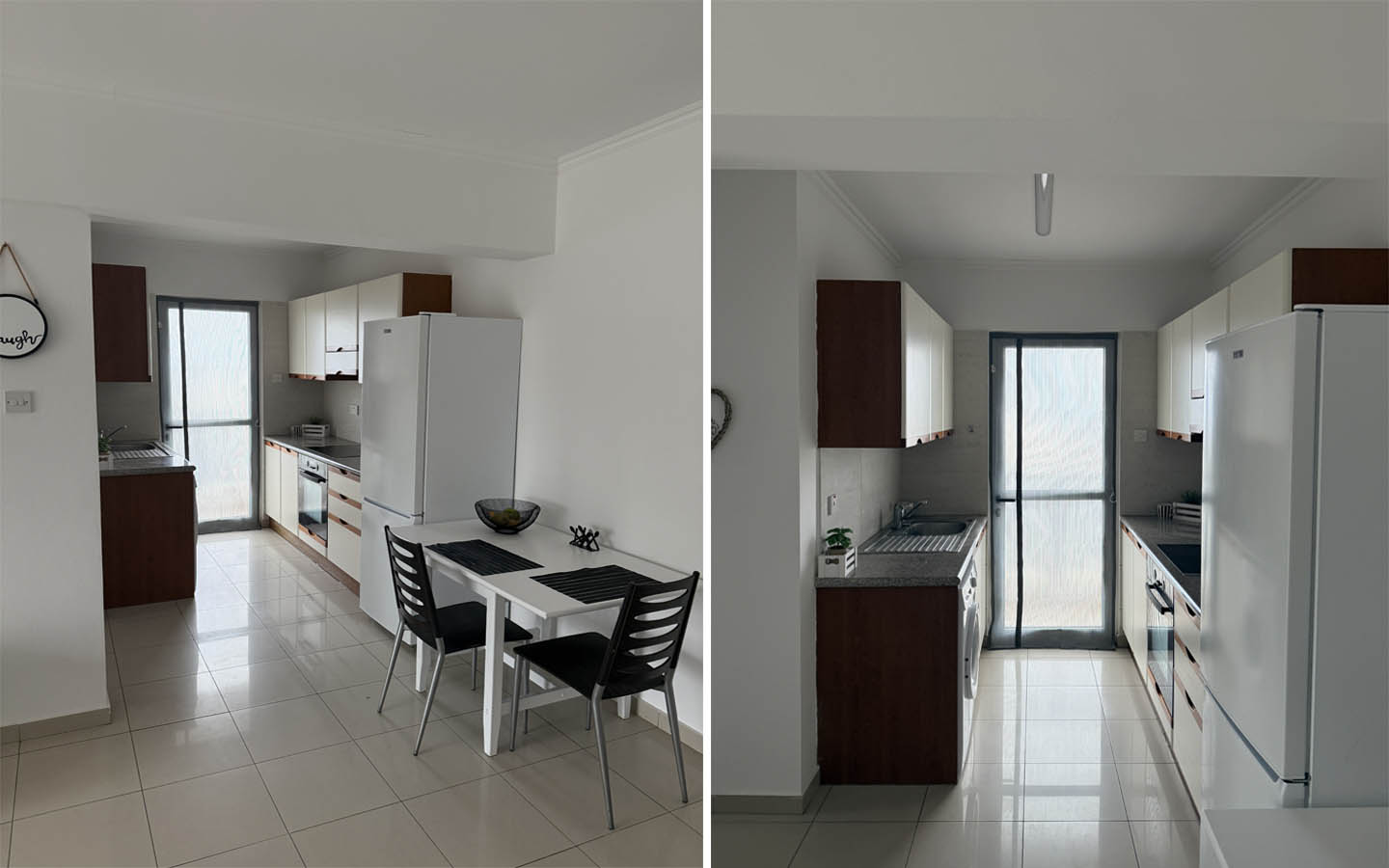 The interior layout of the apartment has been designed in a very logical way. The living room welcomes you with soft natural light flowing freely through the large sliding doors, making the space feel even more open and airy. Light floor tiles reflect the daytime sun, white walls create a neat and neutral backdrop, while furniture in calm grey and wood tones gives the interior a finished, contemporary character. It is easy to imagine a morning coffee by the balcony, an unhurried day in the cool comfort of the air-conditioned interior, and a quiet evening when the home becomes your own private refuge from the pace of the city.
