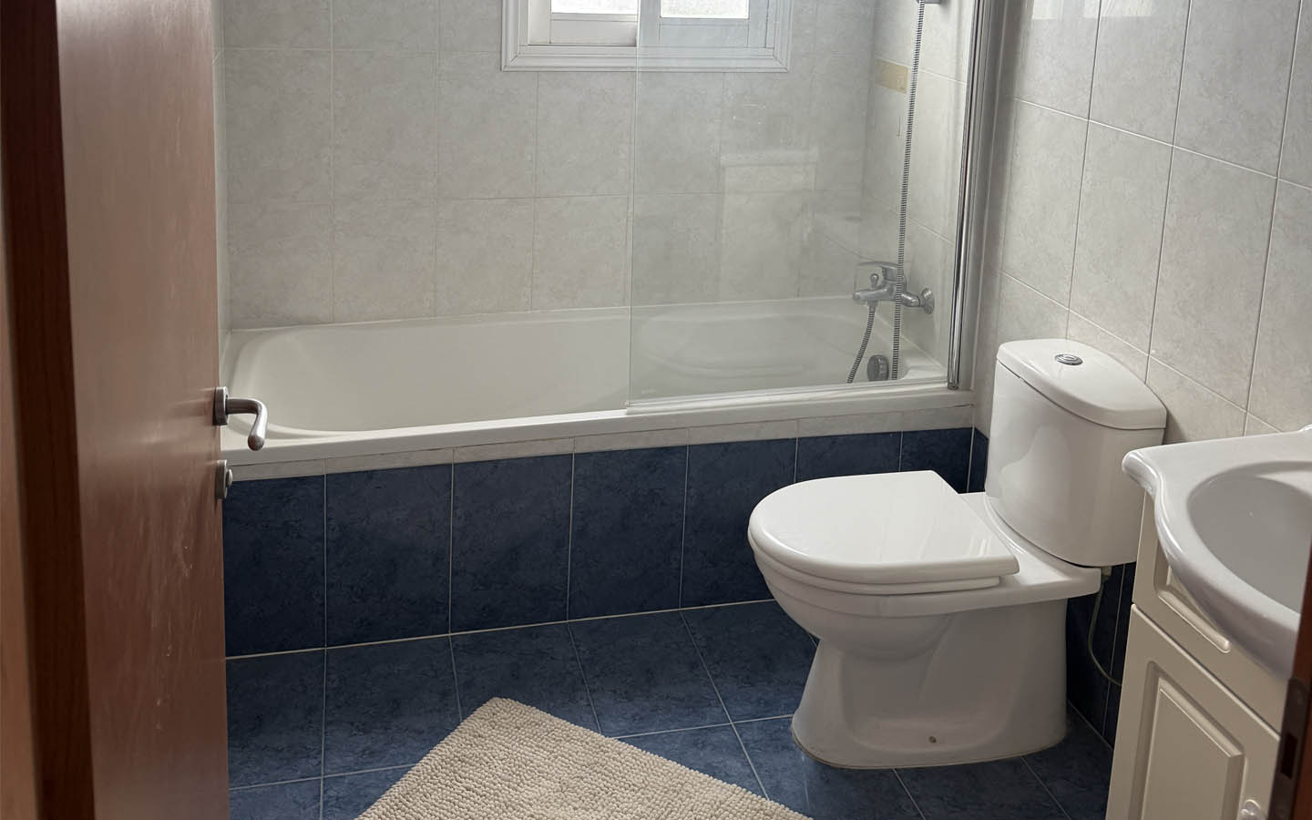 The bathroom is spacious and neat, finished in light tiling with a contrasting deep blue tone along the lower section. The presence of a full-sized bathtub makes the apartment especially attractive not only for a single occupant or a couple, but also for long-term living. Everything appears clean, well-kept, and practical — without visual noise and without unnecessary details.