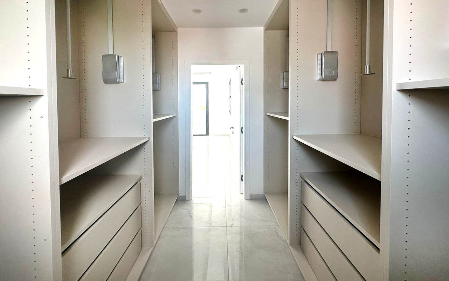 The upper floor is dedicated to privacy and relaxation. It hosts three spacious bedrooms, including a luxurious master suite with a walk-in closet and en-suite bathroom. The master bedroom opens onto a private terrace—an ideal setting for morning coffee in complete seclusion. The walk-in wardrobe is finished in light tones and thoughtfully organized for maximum comfort and order.