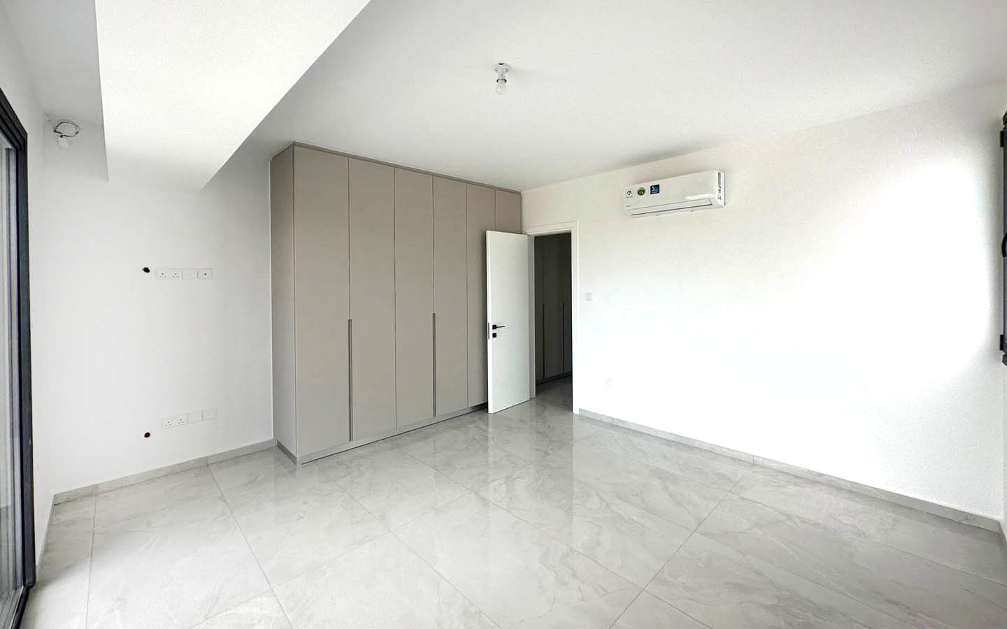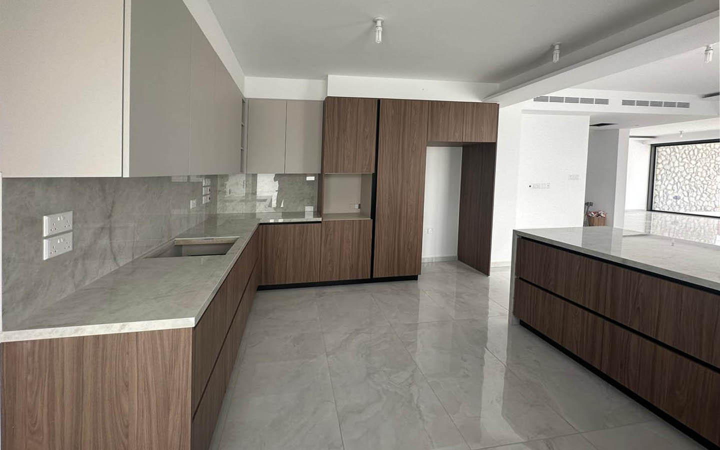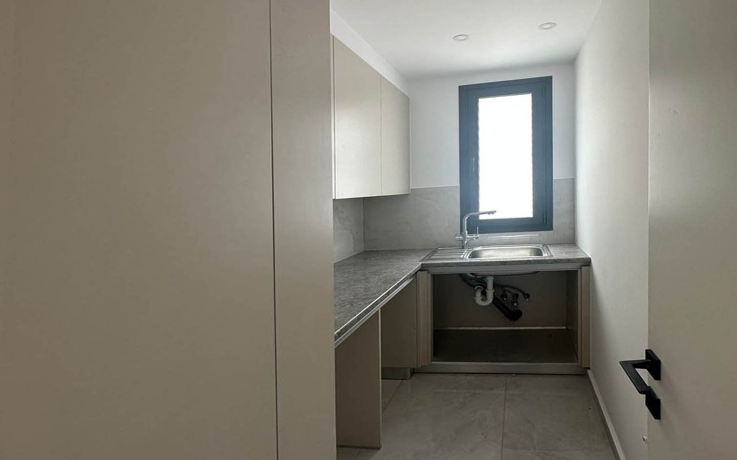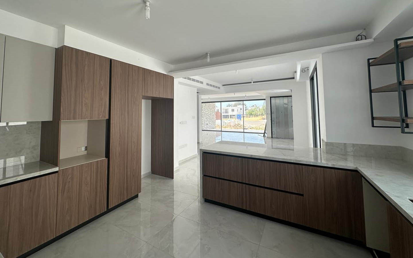 Inside, the villa embraces an open-plan layout where the living room, kitchen, and dining area flow as one unified and luminous space that opens directly to the private outdoor area. Glossy ceramic tiles, a soft neutral palette, and precise architectural geometry create an elegant yet understated ambiance. The modern kitchen is fully equipped with custom cabinetry and a central island topped with stone, marrying functionality with striking aesthetics.