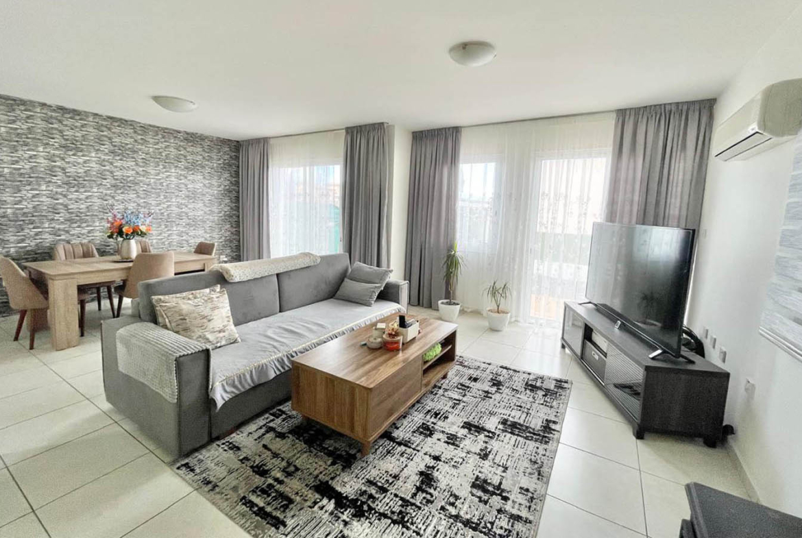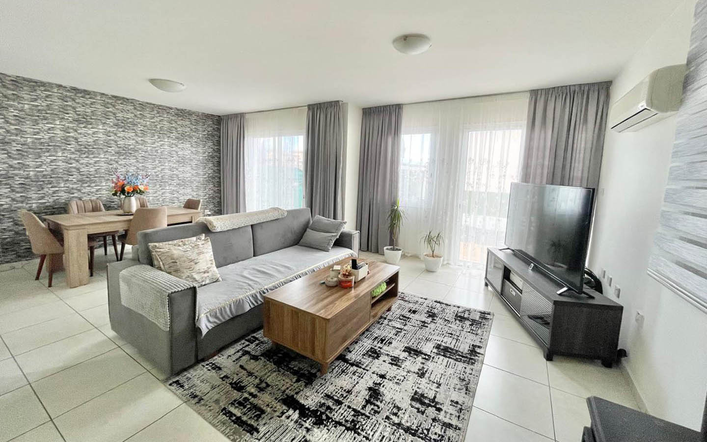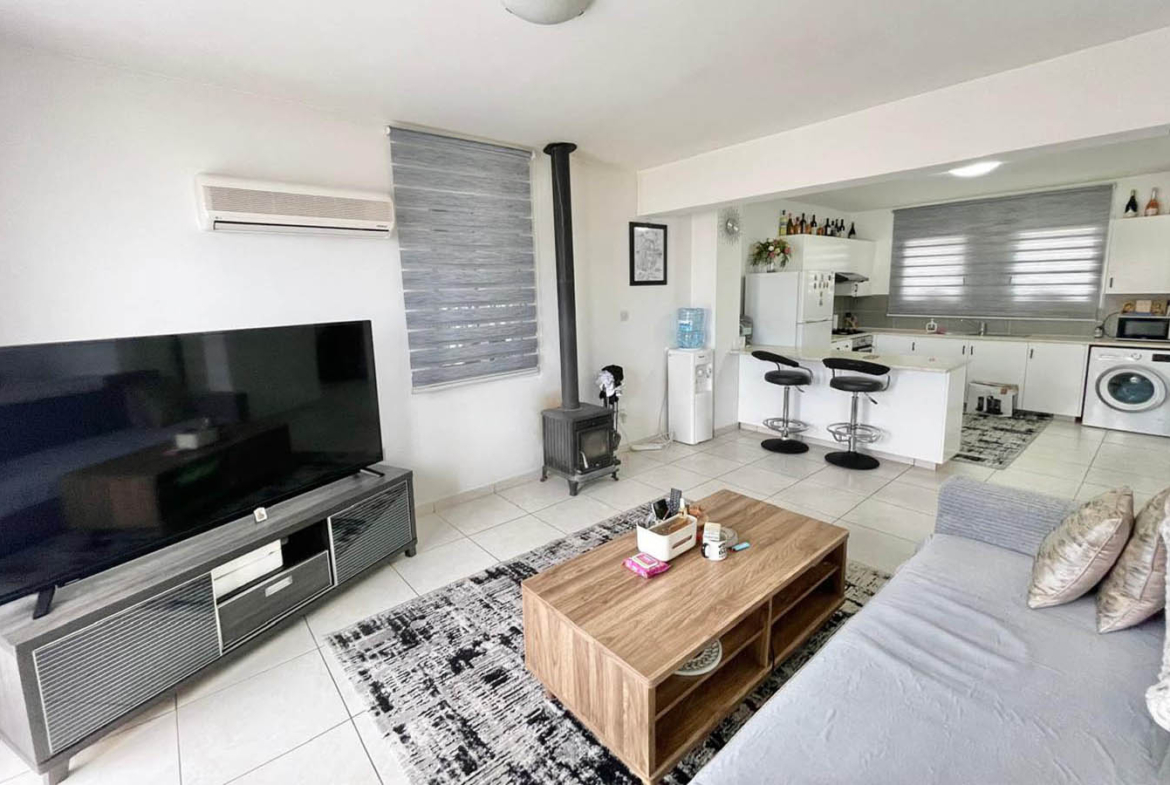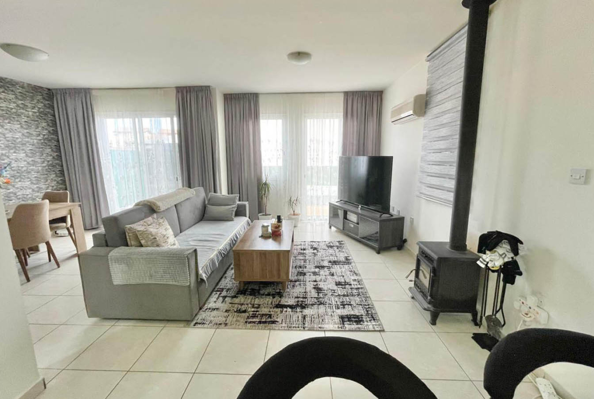 The living room continues the same airy mood: light floor tiles, neutral tones, and generous windows with sliding doors that invite in both fresh air and a sense of openness. At the heart of the room is a comfortable lounge area with a sofa and TV, and beside it a truly homely feature that instantly transforms the atmosphere during the cooler months—a wood-burning stove. This is the home’s real focal point, the place people gather in the evenings with a blanket, a book, and a glass of wine. Air-conditioning takes care of summer comfort, while solar panels provide hot water—practical, economical, and so very Cyprus.