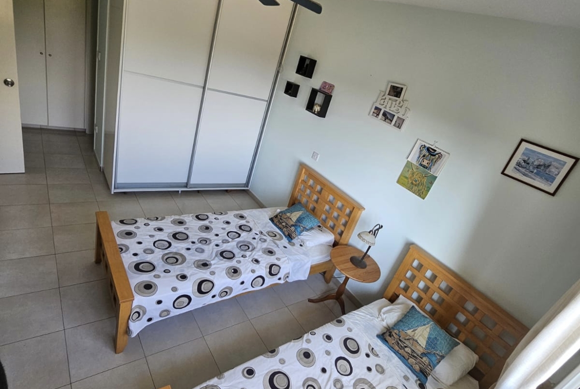 The apartment is located on the top floor, offering open green landscapes of Pegeia and some sea view. High ceilings and large windows flood the rooms with natural light, creating an atmosphere of warmth and freedom. The living room and kitchen form an open-plan space, decorated with modern finishes: quartz countertops, elegant furnishings, and high-quality appliances create a setting for comfortable living and cozy family evenings.
