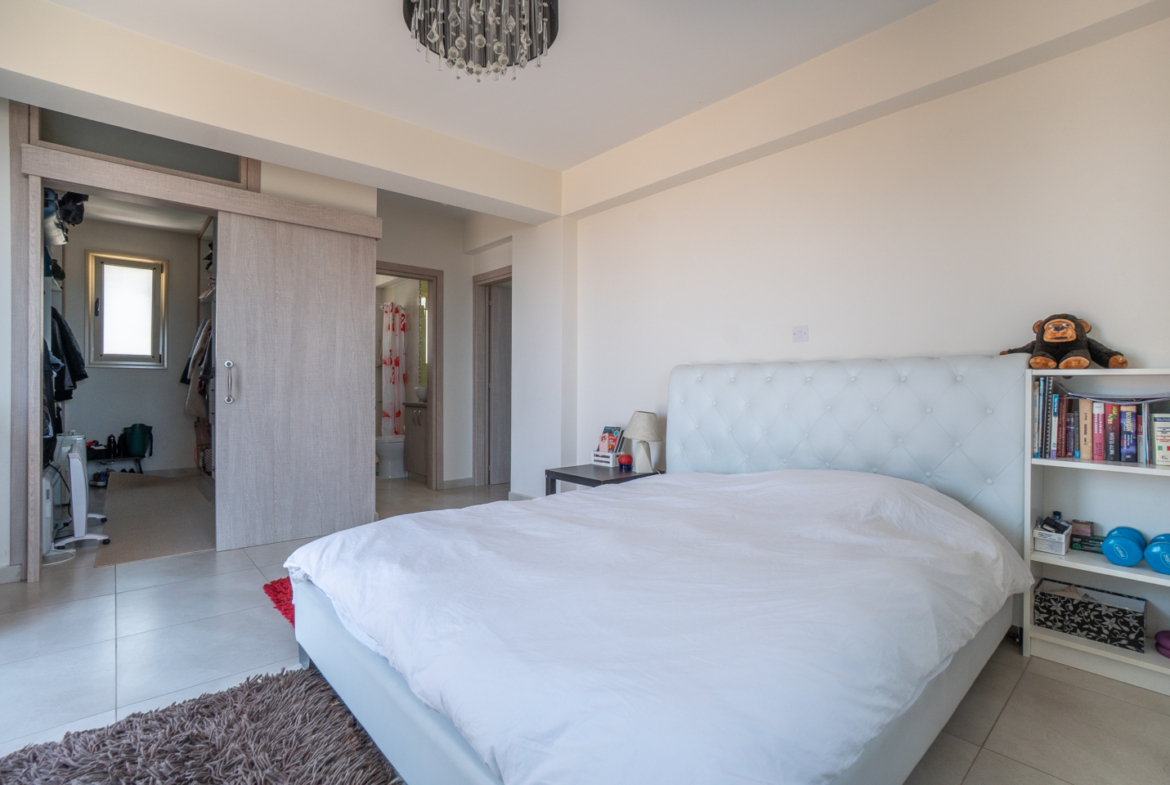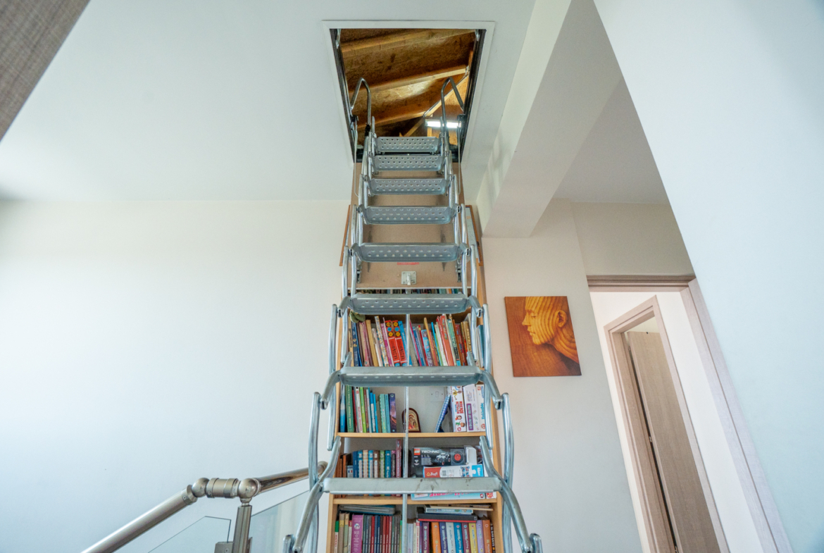 The spacious master bedroom feels like its own world — complete with a walk-in closet and private bathroom. The view from the window is one you’ll never tire of: a blanket of greenery, village rooftops, and beyond, the horizon where sky meets sea. A retractable ladder in the ceiling leads to the attic — offering extra storage or a creative nook, if imagination allows.