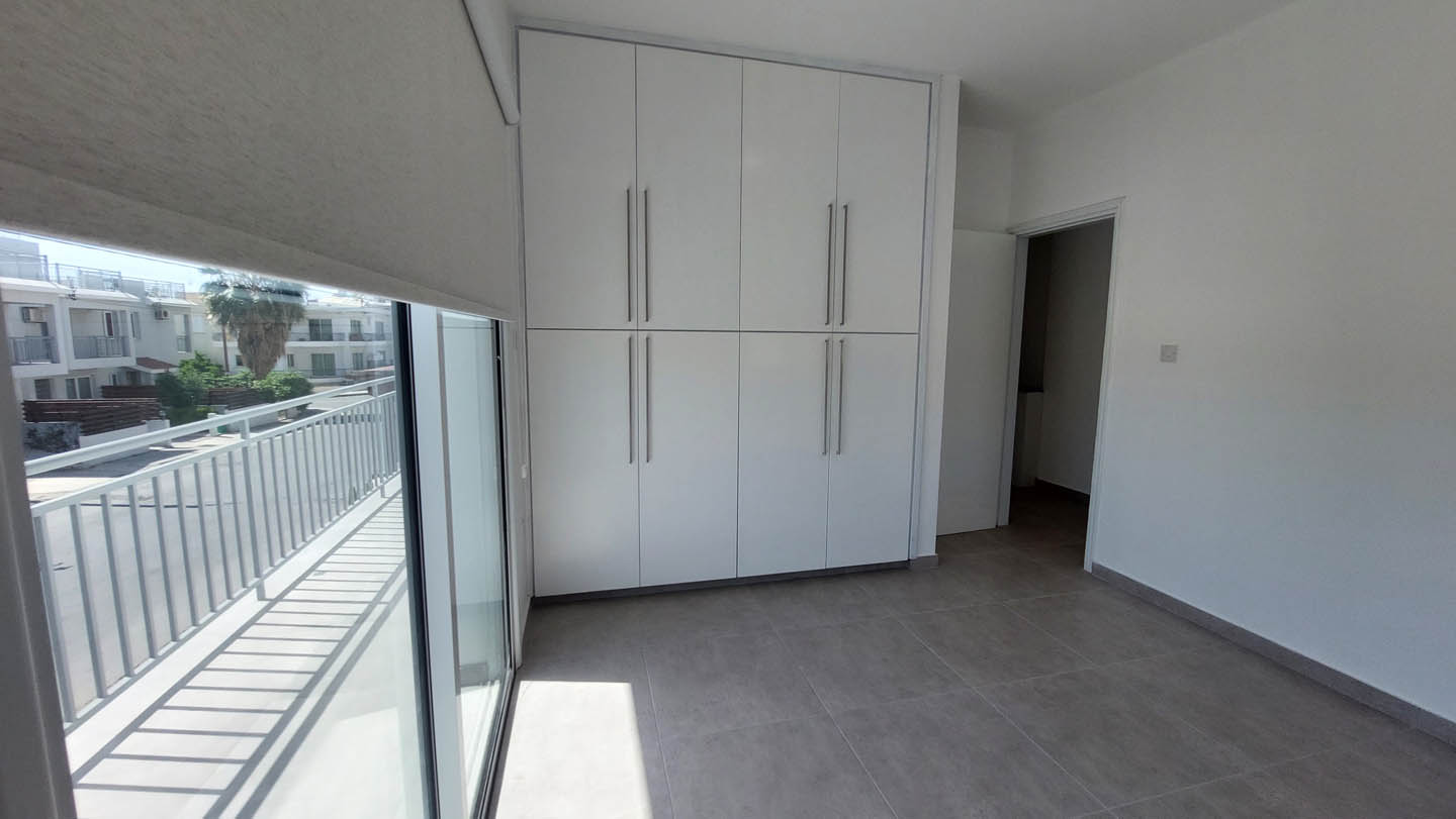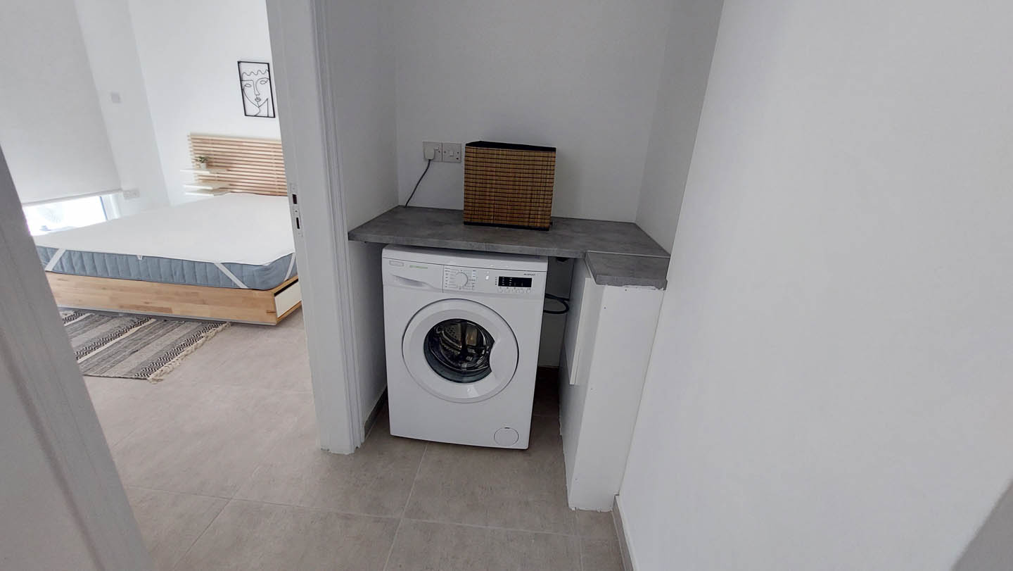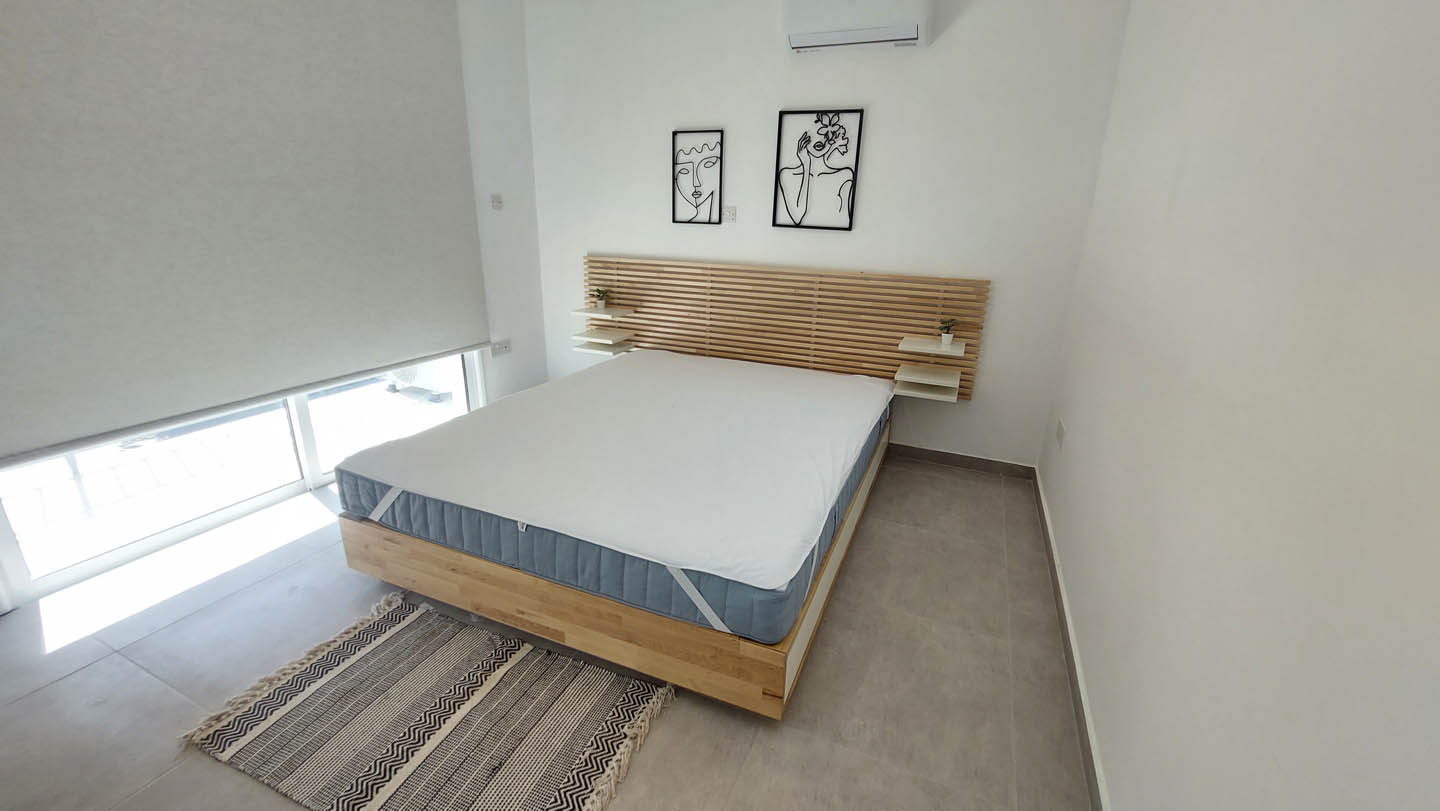 The exterior carries the same energy. A crisp white façade, clean geometric lines, glass railings, and an unassuming modernity. This isn’t a building trying to impress. It simply is — complete, balanced, assured. Covered allocated parking, individual storage units for each apartment, private entrances, and access to a shared rooftop terrace with open sky views over the warm Cypriot horizon.