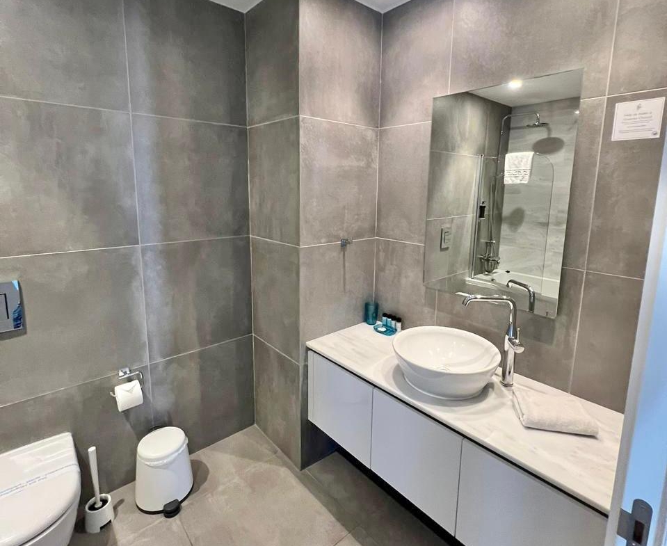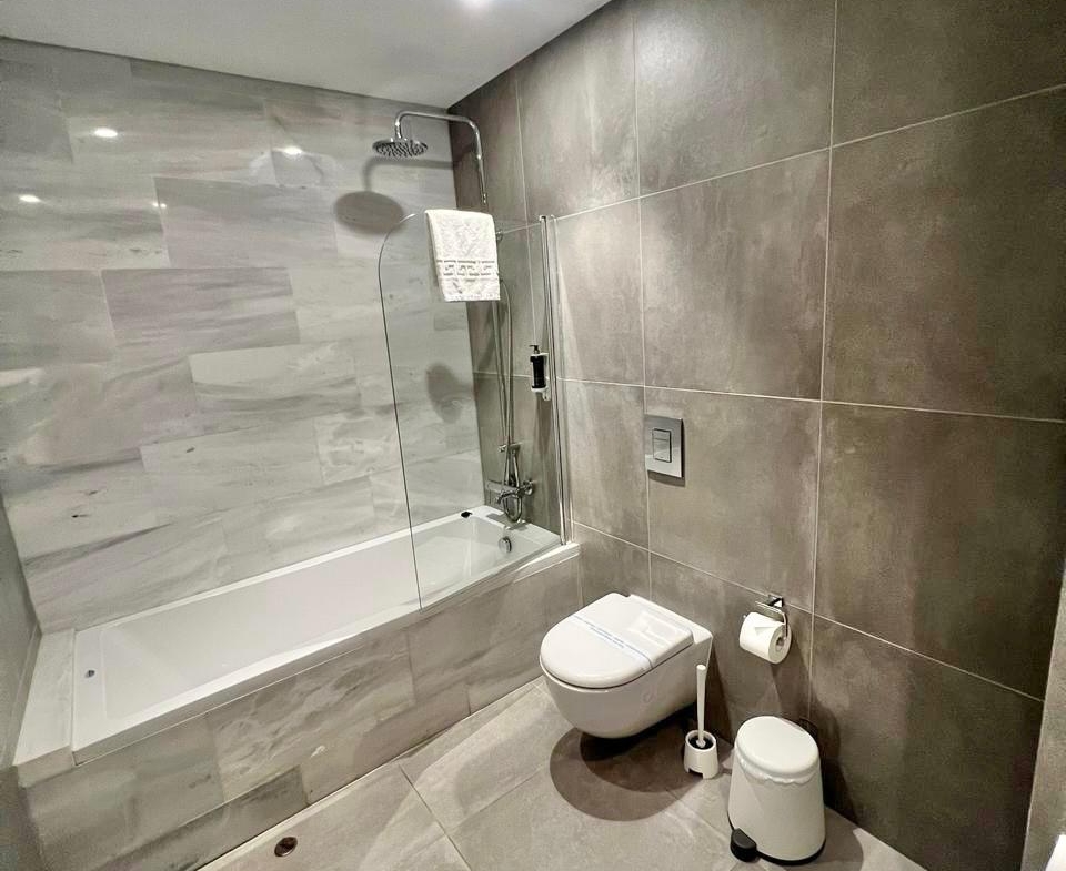 For everyone, there’s a family bathroom with the essentials done right: a deep tub with a glass screen, overhead rainfall shower, wall-hung toilet and a serene palette of large tiles reminiscent of natural stone. Everything feels fresh and well cared for — you can see the thoughtful renovation and careful maintenance.