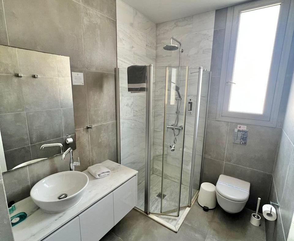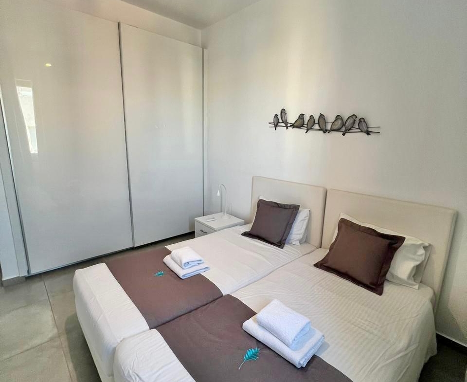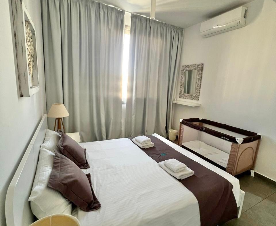 The bedrooms continue the theme of calm. In the main one there’s a generous bed, a soft palette of white and graphite, heavy curtains that mute the midday sun and air-conditioning for comfort in the hotter months. A private bathroom ensures morning routines run without queues.