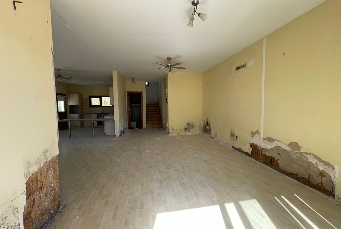 Inside are 148 square metres arranged without excess. The ground floor is a generous open space that once united living, dining and kitchen areas. Today it frankly shows that the house needs work: traces of leaks and rising damp along the lower perimeter of the walls, localised blistered plaster, darkening near the skirting. Ceilings are even but call for skim coating; the wood-effect floor tile visually draws the room toward the sun at the glazed doors. An arched opening separates a winter-garden or home-office nook—bright, with its own exit to the outside—where the landscape reads especially well through the windows. The kitchen is defined by an L-shaped run with a tiled backsplash; worktops and fronts are tired, yet the footprint is practical, and a separate door to the yard adds convenience. This level also hosts a guest WC—useful for family life and future rental use.