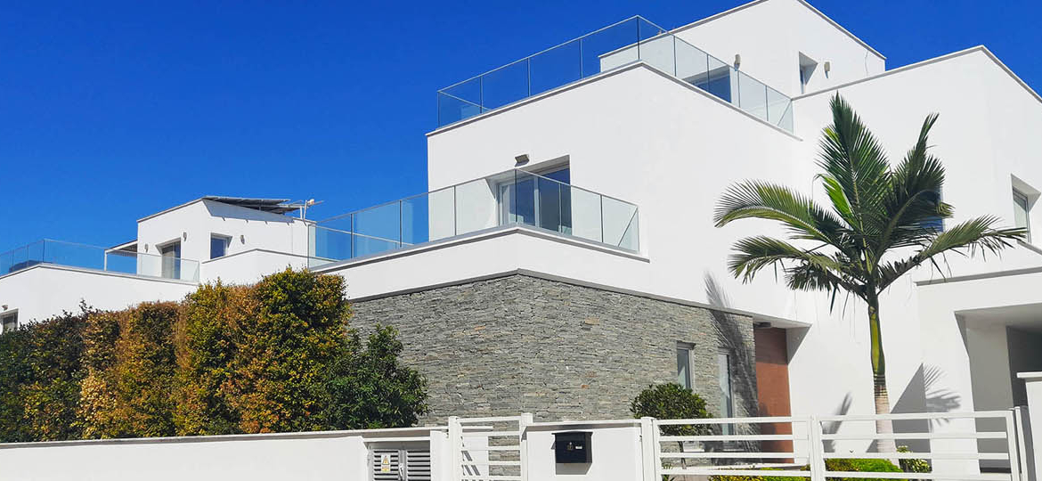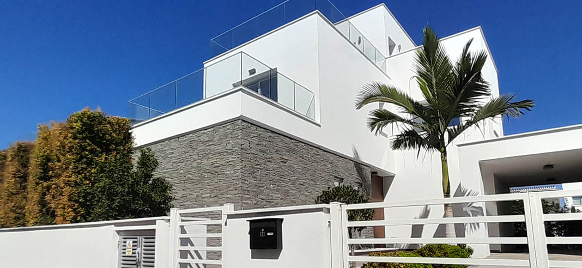 Contemporary, light-filled, and confident in its lines, this villa feels like a thoughtfully composed space for those who value privacy, architectural clarity, and proximity to the sea, yet do not wish to give up the convenience of an urban setting. From the very first glance, it is clear that much of its appeal lies in contrast: crisp white volumes, graphic planes, decorative stone accents, glass balustrades on the upper terraces, and the soft shadows of the pergola falling beautifully across the waterside terrace. The house appears composed, elegant, and distinctly European, free from excess ornamentation yet full of character.