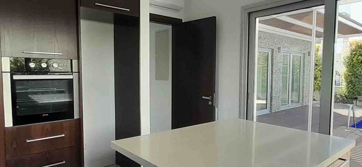 Inside, the home unfolds not as a series of rooms, but as one coherent environment. The open-plan layout gives the ground floor a sense of freedom and movement. The kitchen immediately sets the contemporary tone for the entire interior: dark wood cabinetry, pale work surfaces, neatly integrated appliances, and a large central island that brings the space together and easily becomes the setting for morning coffee, family dinners, and casual conversations in passing. Large windows above the worktop allow in abundant natural light, while sliding glass doors connect the kitchen and the indoor living space with the pool and terrace so naturally that the boundary between inside and out almost disappears.