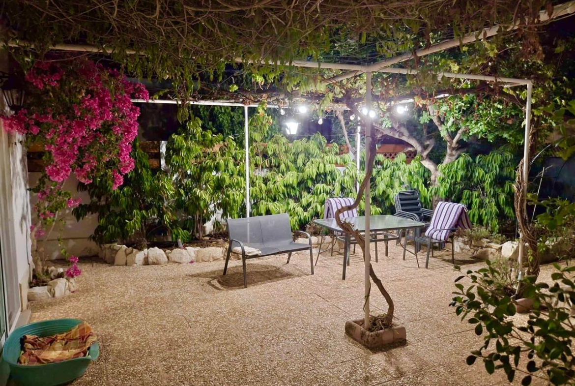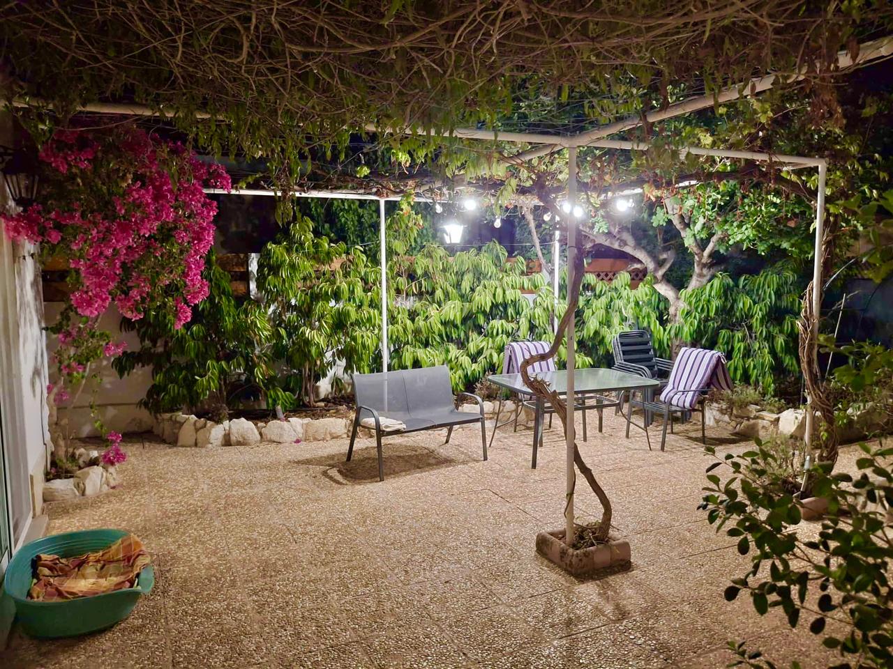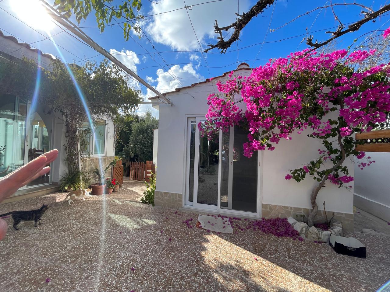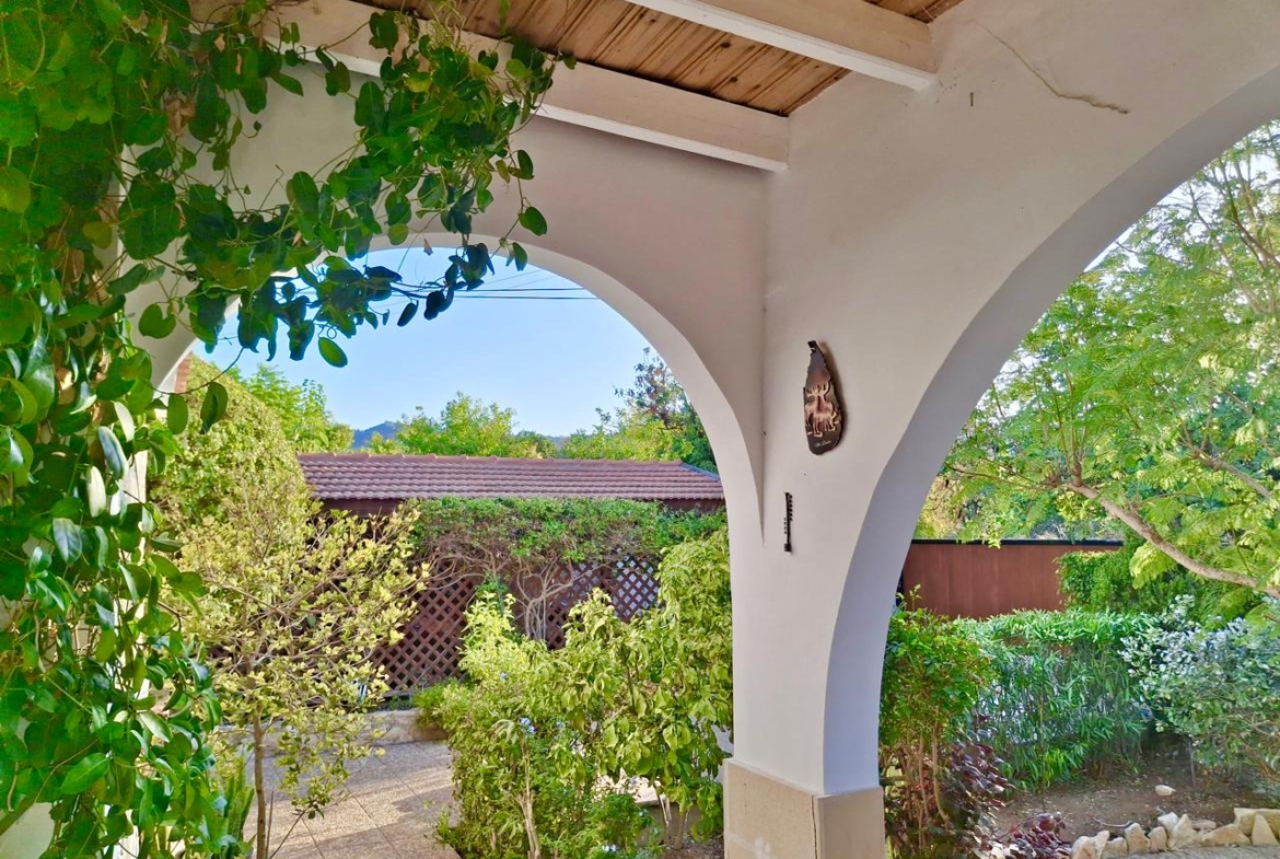 Arched spans of the covered veranda, the warm edge of a timber ceiling, light shimmering through the leaves. Bougainvillea scatters fuchsia petals across the tiles, and it’s instantly clear: this is not just a bungalow but a small private world in a “near-secret” corner of suburban Paphos where you’ll want to linger.