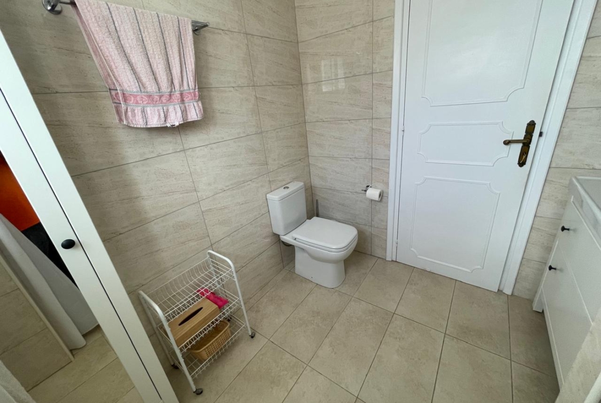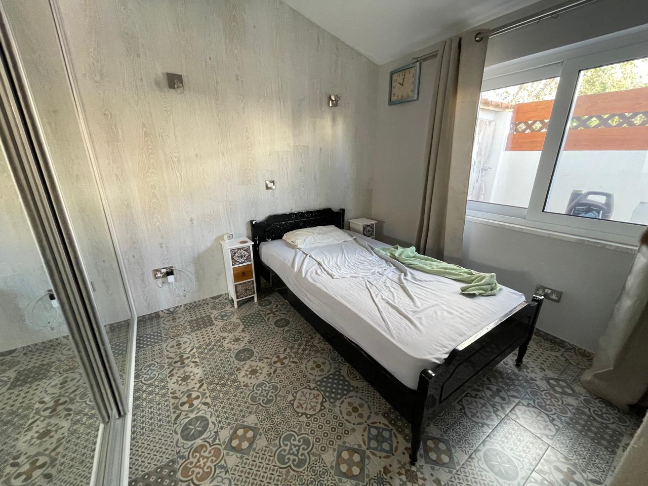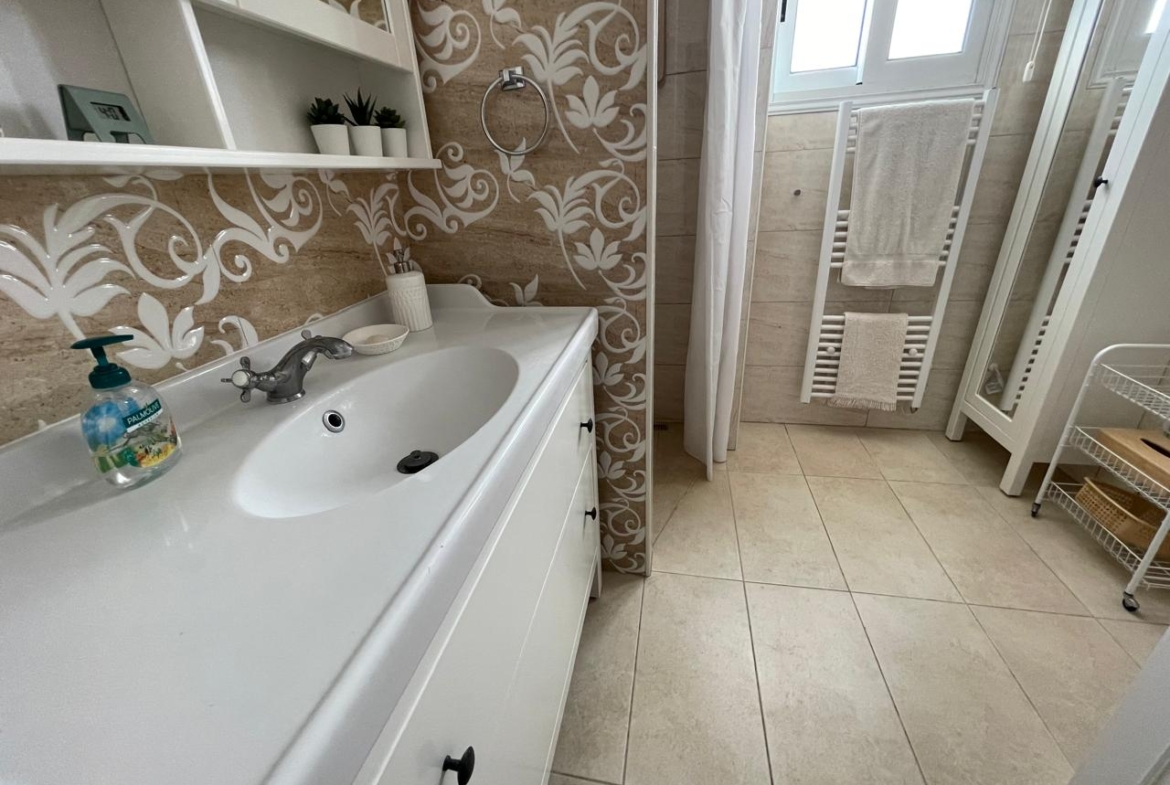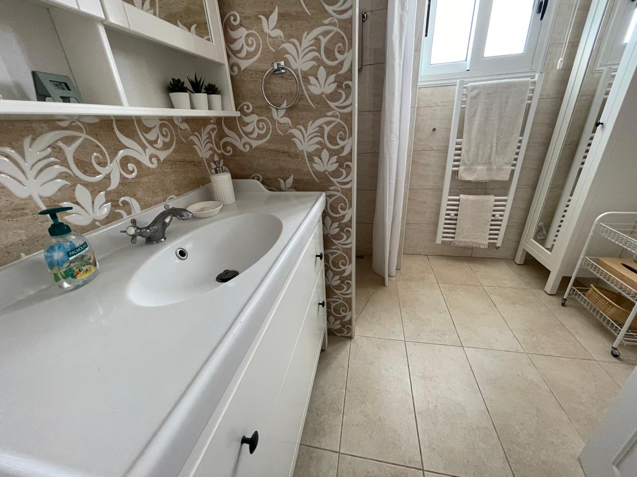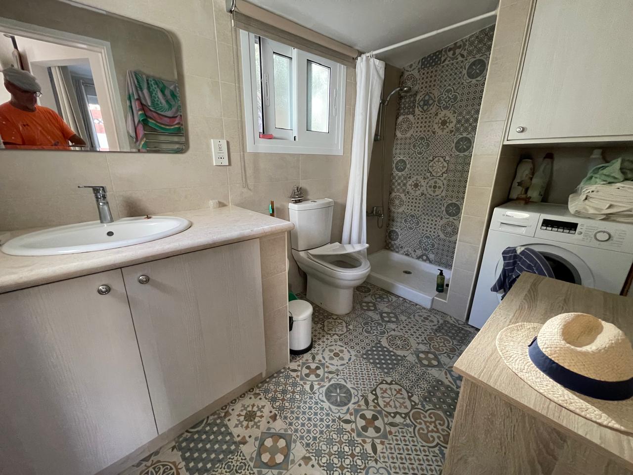 The main house features a separate kitchen—a real rarity in today’s layouts and a gift for those who value order and quiet in the lounge. It’s practical and well equipped, naturally following the home’s style. There are two bathrooms; in one, the walls and floor are patterned with a patchwork of decorative tiles, adding a warm Mediterranean graphic touch without excess; the laundry area is conveniently integrated there as well. Three bedrooms are tuned for calm: light walls, plenty of air and views of greenery—the space works for rest, not display.